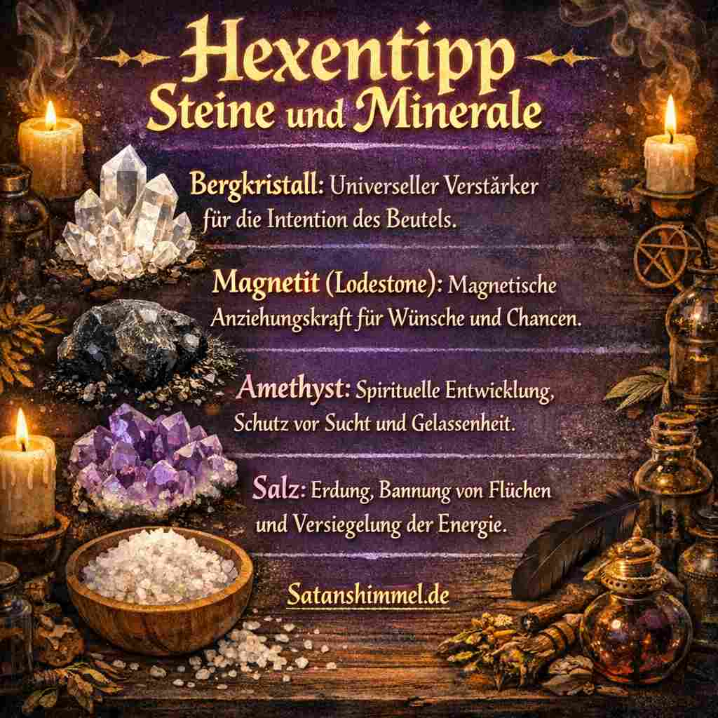 Ein sorgfältig zusammengestellter Mojo-Beutel ist weit mehr als nur ein Accessoire – er ist ein treuer spiritueller Begleiter, der deine innere Kraft bündelt und deine Wünsche im Alltag kontinuierlich mit der geistigen Welt vernetzt. Auf Satanshimmel findest du alles, um dein Hexenwissen zu vertiefen. Ausführlichere Infos enthalten die Satanshimmel- Magiebücher!